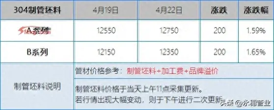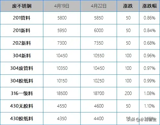 较上周五早间,今日早间市场201报价上涨50-100元/吨;304报价上涨100-200元/吨;目前主流报价区间:201新料在5900-6000元/吨,个别在6050元/吨左右;304新料在10500-10600元/吨,其中集中在10500-10550元/吨。
